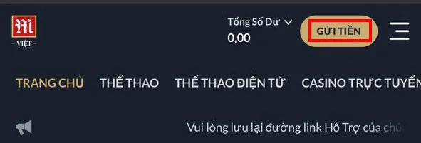 Sau khi đăng nhập vào tài khoản M88 thì tại giao diện trang chủ, bạn nhấn vào nút GỬI TIỀN màu vàng ở góc trên cùng bên phải màn hình (cạnh phần hiển thị tổng số dư).