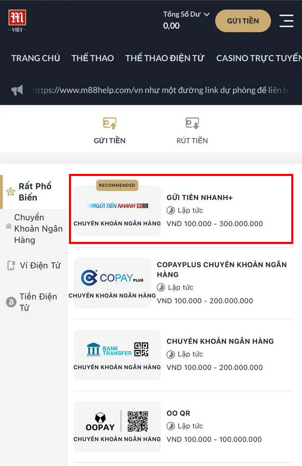 Gửi tiền M88 là bước quan trọng để bạn có thể tham gia đặt cược. Theo đó, nhà cái M88 đã hỗ trợ đa dạng kênh nạp tiền như chuyển khoản ngân hàng, ví điện tử và tiền điện tử. Trong đó, phương thức Gửi Tiền Nhanh+ qua mã QR được khuyến khích sử dụng nhờ tính tiện lợi, độ chính xác cao và thời gian cập nhật số dư cực nhanh.