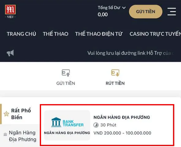 Sau khi đăng nhập M88, tại giao diện quản lý tài chính, bạn chọn vào mục RÚT TIỀN. Tiếp theo, hãy chọn mục NGÂN HÀNG ĐỊA PHƯƠNG. Đây là phương thức phổ biến hỗ trợ hạn mức rút từ 200.000 VNĐ đến 100.000.000 VNĐ.